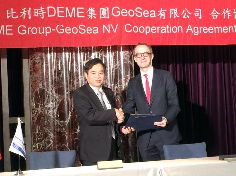 CSBC Corp, Taiwan (台灣國際造船) yesterday inked an agreement to form a joint venture with marine engineering company GeoSea NV — a subsidiary of Dredging, Environmental and Marine Engineering NV (DEME) — to tap into the market for offshore wind farms.