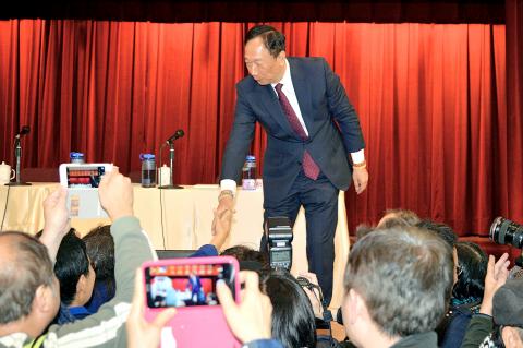 “The public continues to see Hon Hai as a contract electronics maker... We are transforming from a traditional hardware manufacturing firm into a company that provides platforms and solutions,” Gou told a provisional shareholders’ meeting at the company’s headquarters in New Taipei City’s Tucheng District (土城).