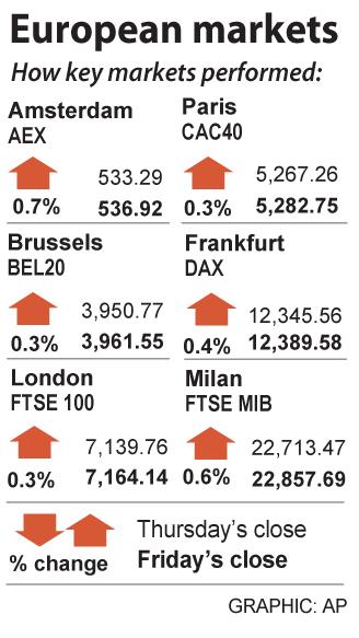 Germany’s DAX on Friday rose 44.02 points, or 0.4 percent, to 12,389.58 following a delayed open. The index edged up 0.3 percent from a close of 12,346.68 a week earlier.