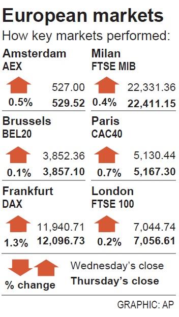 In Paris, the CAC 40 on Thursday revved 36.86 points, or 0.7 percent, higher to 5,167.30 on broad gains among automakers. That was an increase of 1.4 percent from 5,095.22 on March 23.