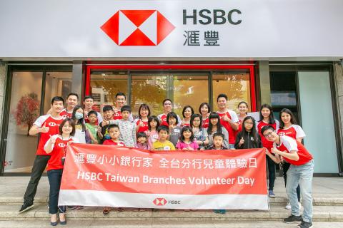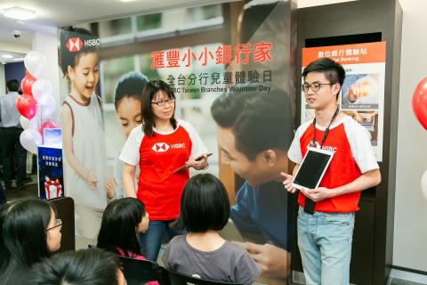 HSBC Taiwan Ltd yesterday organized a volunteer event simultaneously at its 30 branches nationwide with an aim to allow elementary school children first-hand experience of its banking facilities and services.