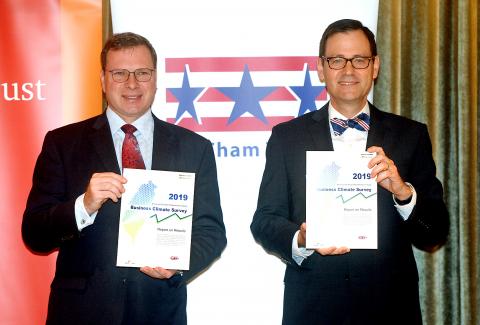 US companies operating in Taiwan are significantly less confident than last year about Taiwan’s economic outlook this year, amid concerns over five key issues — trade disputes, Chinese pressure, cybersecurity, US trade policy and intellectual property rights infringement — the American Chamber of Commerce in Taipei (AmCham) said yesterday.
