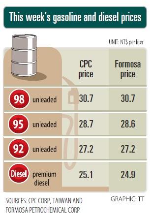 With the increase, prices at Formosa gas stations will be NT$27.2 per liter for 92 octane unleaded, NT$28.6 per liter for 95 octane unleaded, NT$30.7 per liter for 98 octane unleaded and NT$24.9 per liter for diesel.