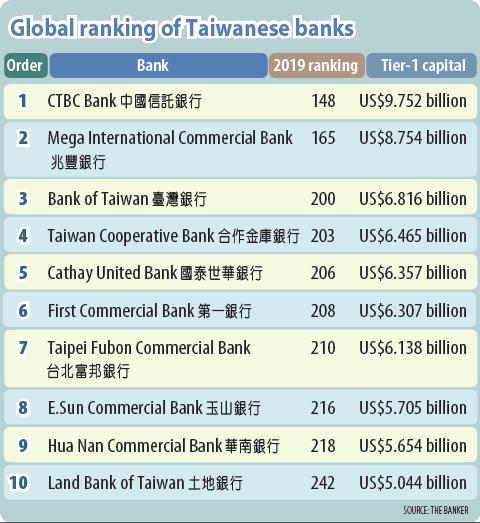 CTBC Bank Co (中國信託銀行) ranked the 148th-largest of the world’s top 1,000 banks this year, up three notches from last year, according to leading financial magazine The Banker.