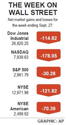 The Dow Jones Industrial Average on Friday dropped 70.87 points, or 0.3 percent, to 26,820.25, sliding 0.4 percent from 26,935.07 a week earlier.
