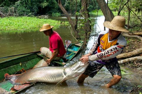 It was brought back from the brink of extinction thanks to the establishment at a nature preserve of a sustainable fishing program with strict quotas. Pirarucu can only be fished from July to November, the non-mating season.