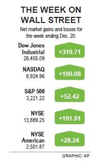 The Dow Jones Industrial Average on Friday climbed 78.13 points, or 0.3 percent, to 28,455.09, an increase of 1.1 percent from 28,135.38 a week earlier.