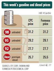 Prices at privately owned Formosa’s pumps are to rise to NT$27.7, NT$29.1 and NT$31.2 per liter for 92, 95 and 98-octane unleaded respectively, while premium diesel is to rise to NT$25.5 per liter.