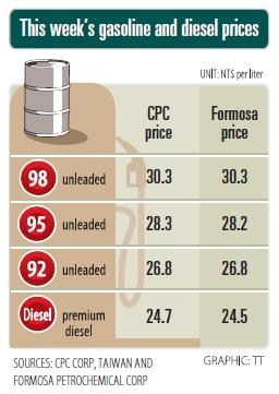 Prices at Formosa Petrochemical’s pumps for 92, 95 and 98-octane unleaded would decline to NT$26.8, NT$28.2 and NT$30.3 per liter respectively, with premium diesel moving down to NT$24.5 per liter, the company said.