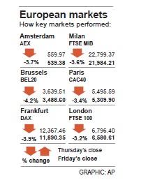 The pan-European STOXX 600 on Friday dropped 15.22 points, or 3.9 percent, to 374.24, plunging 12.6 percent from a close of 428.07 on Feb. 21 and 13.2 percent from a record high on Feb. 19.