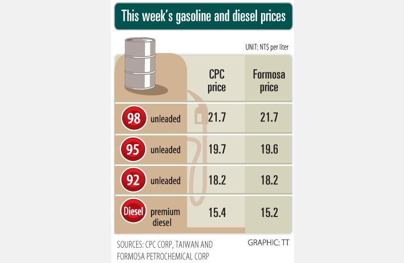 After the adjustments, gasoline prices at CPC’s pump are to drop to NT$18.2 per liter for 92-octane unleaded, NT$19.7 for 95-octane unleaded, NT$21.7 for 98-octane unleaded and NT$15.4 for premium diesel.