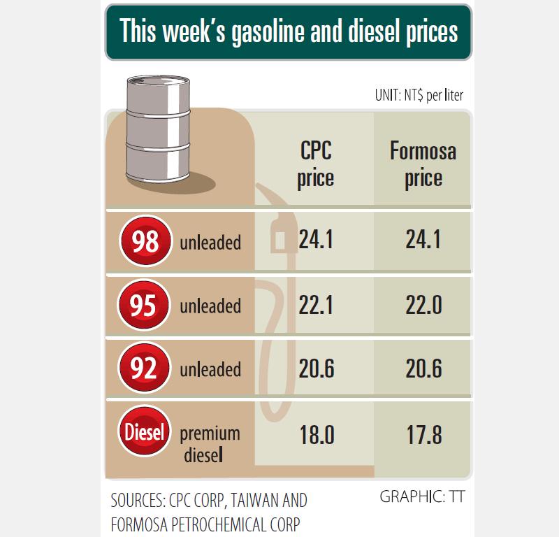 Privately run Formosa’s prices for 92, 95 and 98-octane unleaded are to rise to NT$20.6, NT$22.0 and NT$24.1 per liter respectively, with premium diesel increasing to NT$17.8 per liter, the refiner said.