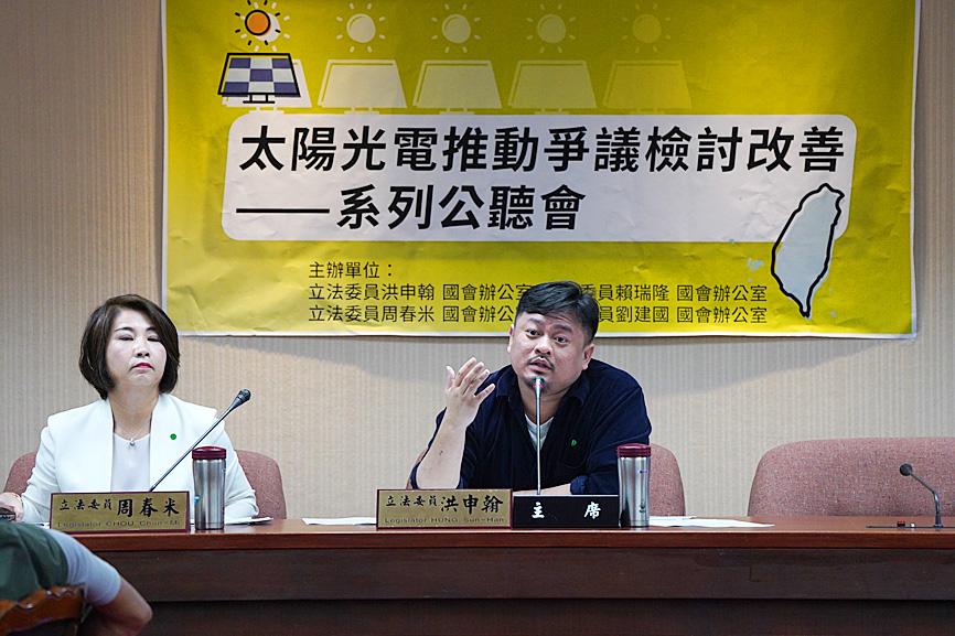 “I’m shocked to hear the minister’s blatant disregard for the government’s green energy goals,” Taiwan Photovoltaic Industry Association president Sam Hong (洪傳獻) said at the hearing.