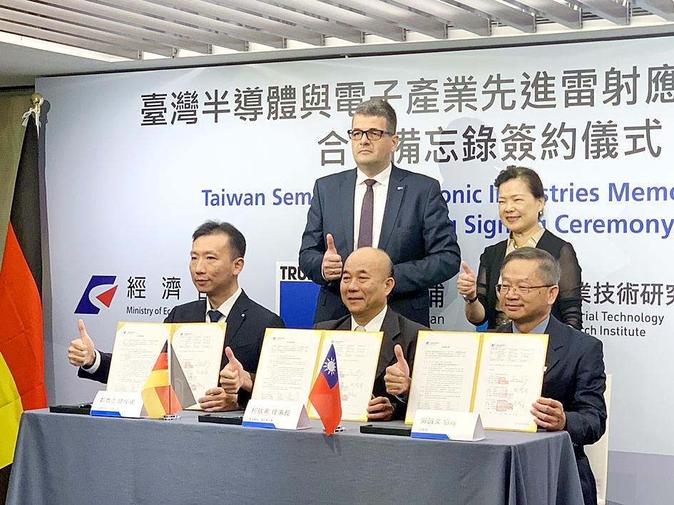 Representatives from Trumpf, ITRI and the Association of Machinery Industry (TAMI, 台灣機械公會) yesterday signed a memorandum of understanding at a press event in Taipei, which was also attended by Minister of Economic Affairs Wang Mei-hua (王美花) and German Trade Office Taipei executive director Axel Limberg.
