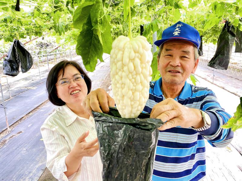 Farmer Chang Chen-jung, right, displays a bitter melon grown in his garden as Dashu District Administrator Wang Hsiao-fen looks on in the district in Kaohsiung yesterday. Chang’s bitter melons won the top prize in this year’s Dashu Bitter Melon Competition, an event held by the local government to help promote the vegetable.