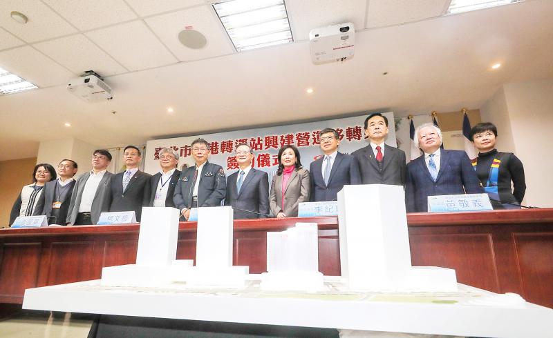 National Property Administration Director-General Tseng Kuo-chi, fifth left, Taipei Mayor Ko Wen-je, sixth left, Shin Kong Life Insurance Co chairman Victor Hsu, center, Shin Kong vice chairwoman Catherine Lee, fifth right, Shin Kong president Huang Min-yi, fourth right, and other guests yesterday pose for a photograph at a signing ceremony for Taipei’s Nangang Bus Station build-operate-transfer project in Taipei. The project, designed to connect railway, high-speed rail and mass rapid transit systems, is expected to be completed in 2025.