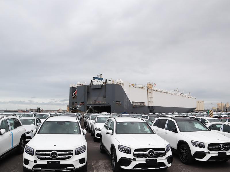 Vehicles are parked near a Norwegian car carrier ship at the Port of Taichung yesterday. About 3,000 luxury vehicles, including BMW, Mercedes-Benz and Mini Cooper cars, were shipped to Taiwan over the weekend due to increased domestic consumption amid border closures caused by the COVID-19 pandemic. The number of vehicles shipped by a single vessel has reached the highest in the port’s 44-year history, the port said.