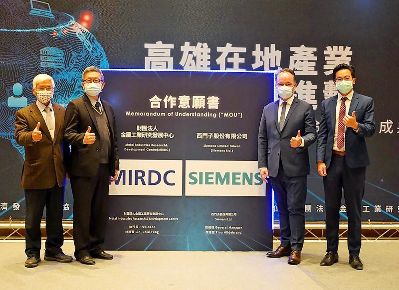 From left, Metal Industries Research and Development Center chairman Lin Jen-yi, CEO Lin Chiu-feng, Siemens Ltd Taiwan digital factory general manager Tino Hildebrand and Kaohsiung Economic Development Bureau Director-General Liao Tai-hsiang attend the signing of a memorandum of understanding between the center and Siemens for cooperation in the smart production in the city yesterday.