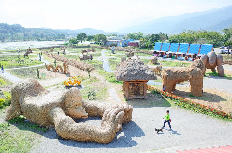 People walk among sculptures at the Rice Straw Art Festival in Hualien County’s Fuli Township yesterday, the first day of the annual event. Twenty installations are on display, including giant sculptures of gorillas and hippos, cows, monkeys, penguins and swans, said the Fuli Township Farmers’ Association, which organizes the event. The festival runs through the end of April in Luoshan Village.