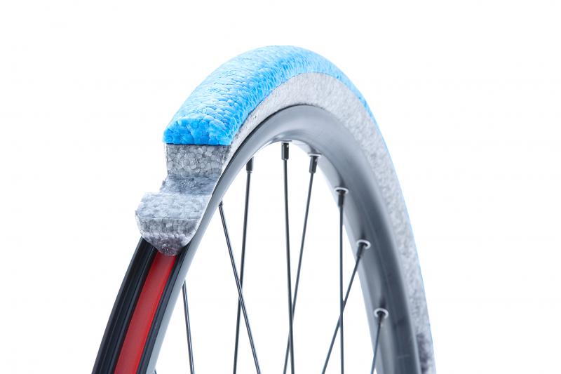 The feature enables cyclists who want to try airless products to continue using their current rubber tires instead of discarding them, and protects the foam-like Air Fom insert from ultraviolet rays, and chemical and water damage, Peterman said.