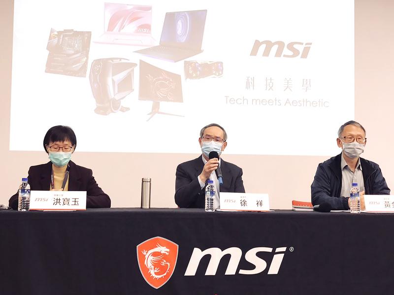 Micro-Star International Co chairman Joseph Hsu, center, speaks at an investors’ conference in Taipei yesterday, after the company reported record-high net profit of NT$7.96 billion (US$279.47 million) for last year, up 42.4 percent year-on-year, with earnings per share of NT$9.42. The company's board of directors has proposed to distribute a cash dividend of NT$6.1 per share. Hsu said revenue this year could increase by a double-digit percentage from last year, due to strong demand for the company’s gaming computers, graphics cards and motherboards.