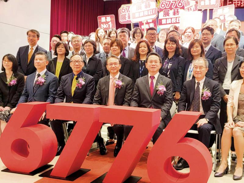 Weblink International Inc chairman Jason Chen, front row center, Weblink president Dave Lin, front row third left, and other guests pose for a photograph at a listing ceremony at the Taiwan Stock Exchange in Taipei yesterday. Weblink, Acer Inc’s distribution subsidiary, is the fourth local company to be listed on the Taiwan Stock Exchange this year. On its debut, its shares surged 178.8 percent to NT$69.7, compared with its initial public offering price of NT$25.