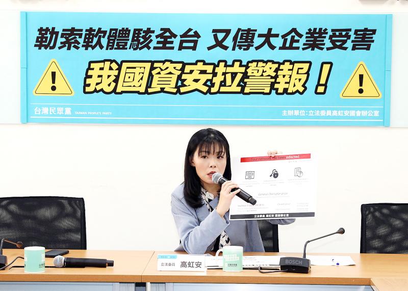 Taiwan People’s Party Legislator Ann Kao (高虹安), a former vice president of Hon Hai Precision Industry Co’s (鴻海精密) industrial big data office, yesterday called on the government to develop concrete plans to help domestic tech companies combat cyberattacks.
