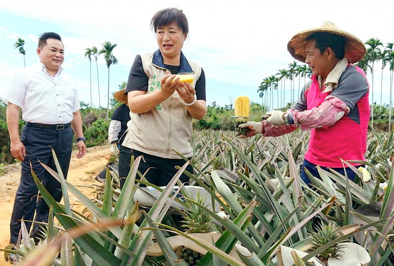 Frida Tsai, chief executive of the Executive Yuan’s Central Taiwan Joint Service Center, center, takes a sliced pineapple from a farmer, right, as local businessman Lo Wen-chin looks on in Nantou County’s Mingjian Township yesterday. With assistance from the center, the township’s pineapples are to be shipped to outlying Lienchiang County’s Matsu Islands.