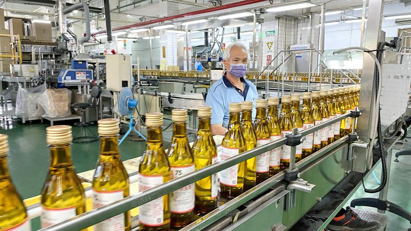 An employee checks bottles of 75 percent alcohol at Taiwan Tobacco & Liquor Corp’s (TTL) Long Tien Distillery in Tainan yesterday. The distillery started to produce 300ml bottles of 75 percent alcohol, with a daily capacity of 120,000 bottles, following a surge in COVID-19 infections. The firm plans to increase daily capacity to 200,000 in two weeks.