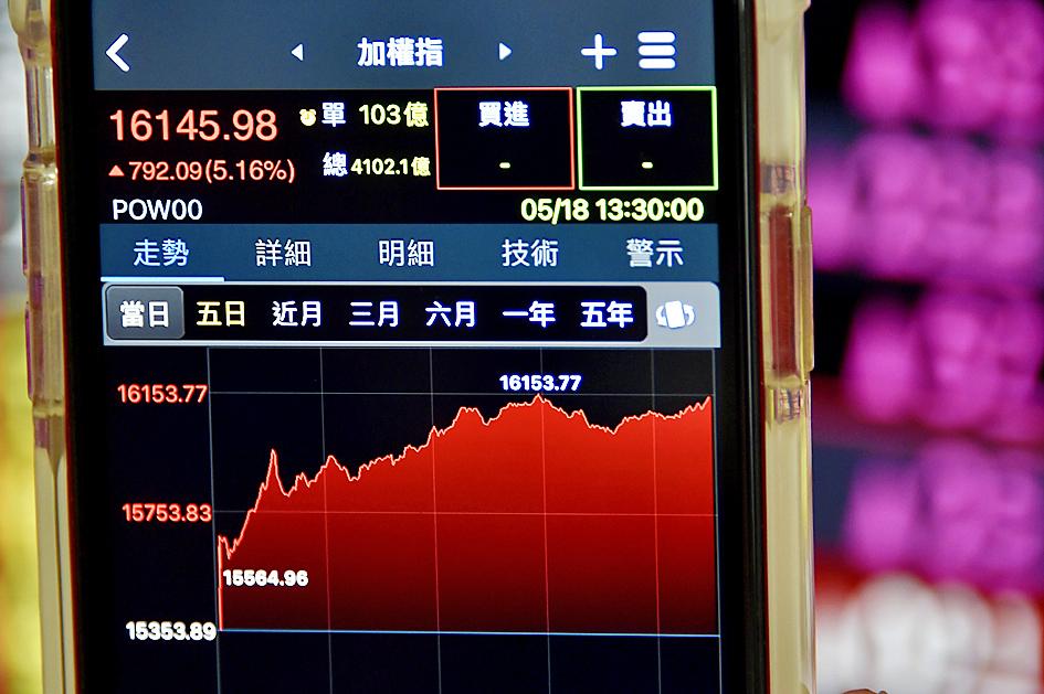 The TAIEX closed up 792.09 points, or 5.16 percent, at 16,145.98. The nearly 800-point gain was the biggest single-day rise in its history, smashing the previous high of 590.19 points on Nov. 29, 1989.
