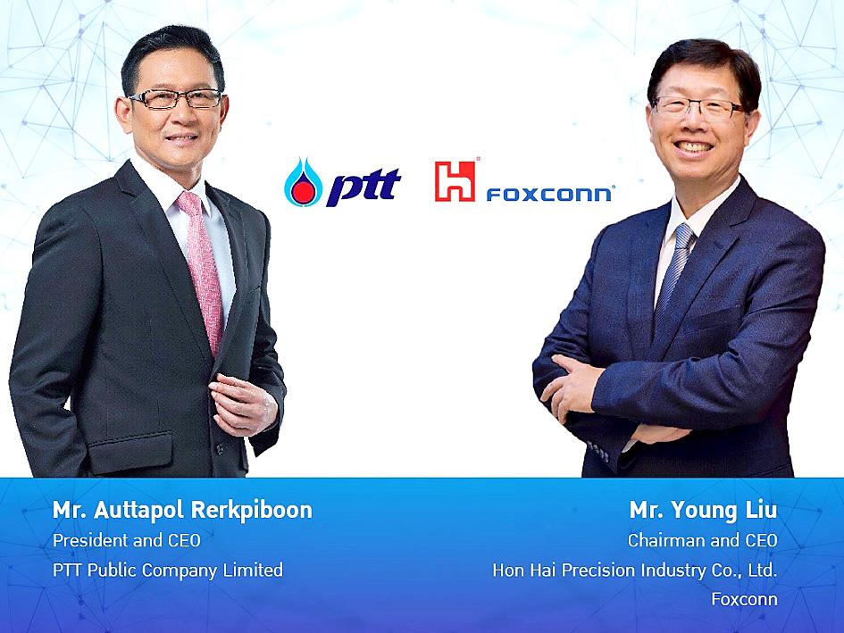 A memorandum of understanding (MOU) was signed virtually by Hon Hai chairman Young Liu (劉揚偉) and PTT president and chief executive officer Auttapol Rerkpiboon, the companies said in a statement.