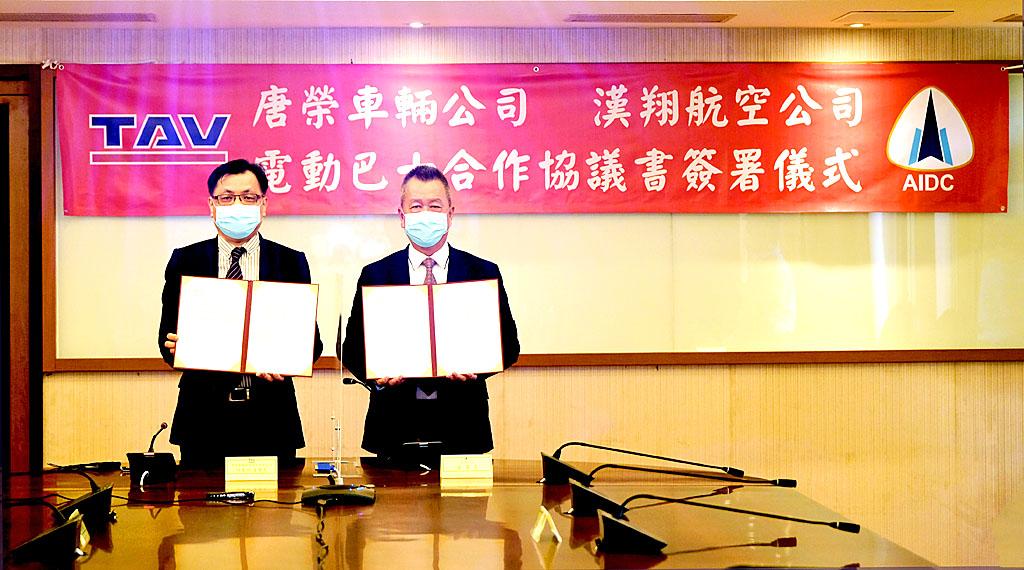 Aerospace Industrial Development Corp (AIDC, 漢翔航空), a maker of military and civil aviation products, said in a statement yesterday that AIDC chairman Hu Kai-hung (胡開宏) had signed a strategic alliance memorandum of understanding with Tangeng Advanced Vehicles Co (TAV, 唐榮車輛) chairman Jonathan Ho (何義純).