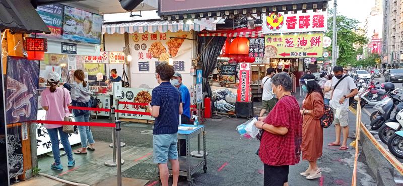 People keep a social distance while buying food at the Ruifeng Night Market in Kaohsiung yesterday as more than 100 vendors began their first day of business. The night market, which has about 400 vendors in total, suspended trade on May 17 after a level 3 COVID-19 alert was issued nationwide.