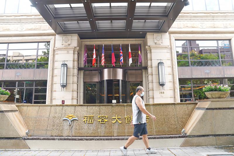 A pedestrian walks past the Fullon Hotel Taipei on Jianguo S Road in Taipei yesterday. The hotel, operated by Lih Pao Group, yesterday announced that it would cease operations on Sept. 1 after a slump in business amid the COVID-19 pandemic and due to the expiration of its lease. The hotel said it aims to maintain its presence in Taipei by opening a new outlet near the Yuanshan MRT Station.