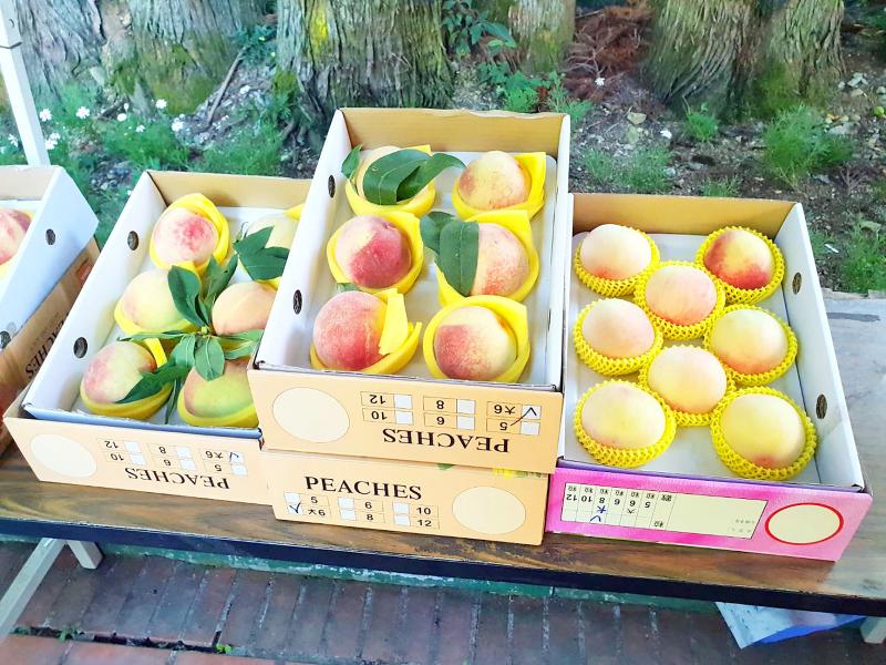 Boxes of peaches are displayed at Wuling Farm in Taichung County yesterday. In the past, the seasonal fruit grown at the farm was only sold to tourists, but as the farm is closed amid a level 3 COVID-19 alert, it is selling the fruit online. Sales are going well as it received orders for about 1,500 boxes of peaches in just 10 days.