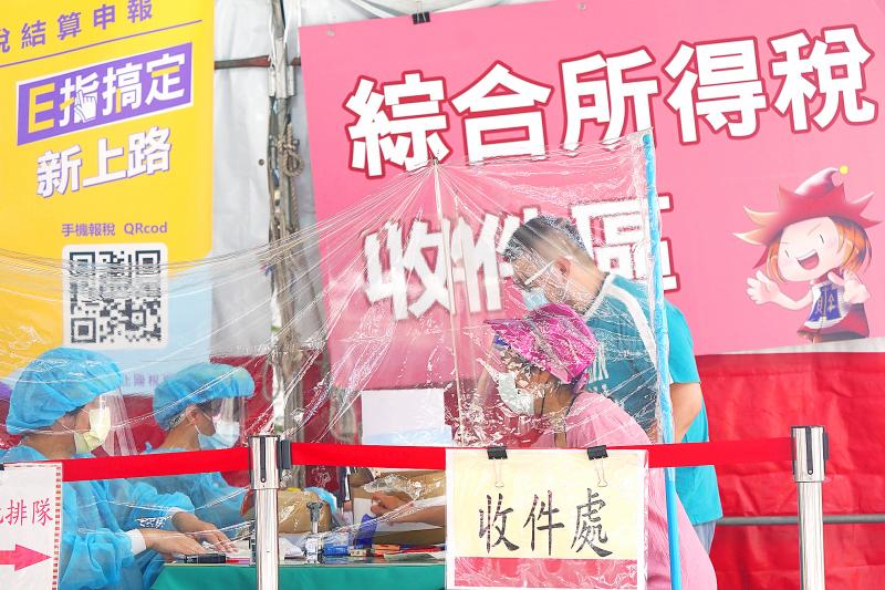 Taipei National Taxation Bureau employees, left, check tax documents submitted by people in Taipei yesterday. The Ministry of Finance yesterday urged people to file individual and corporate income tax returns for last year before the deadline tomorrow, but said it would extend the deadline to Aug. 2 for frontline medical personnel, as they are busy dealing with the COVID-19 outbreak.