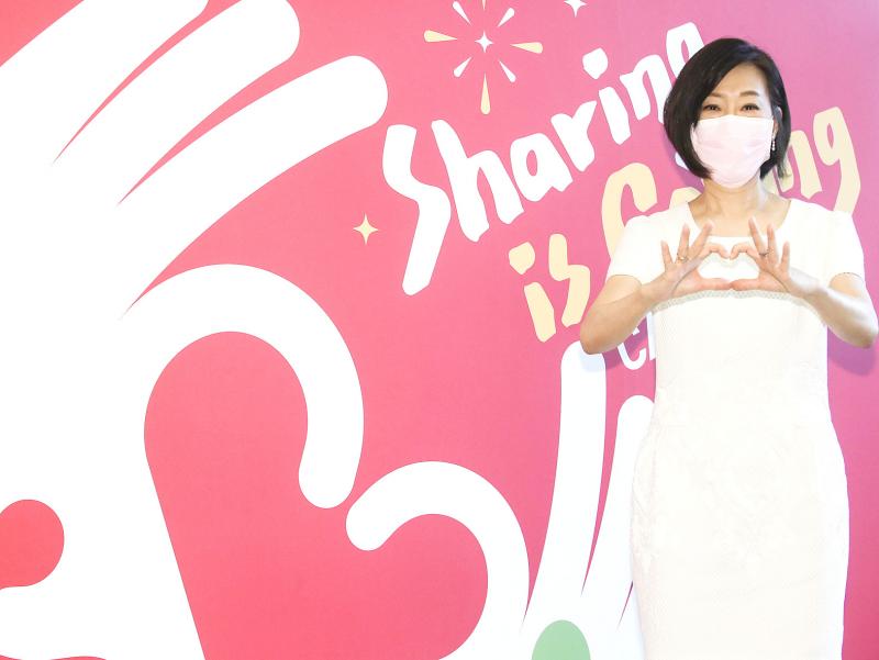 Bureau of Foreign Trade Director-General Cynthia Kiang makes a heart-shaped gesture at a news conference in Taipei yesterday. The bureau announced it is to hold a “Sharing is Caring” event on Sept. 1, encouraging people to come up with proposals that would help improve the environment and community by using Taiwanese products and services. The three best proposals would each receive an award of US$10,000 and a US$150,000 execution payment.