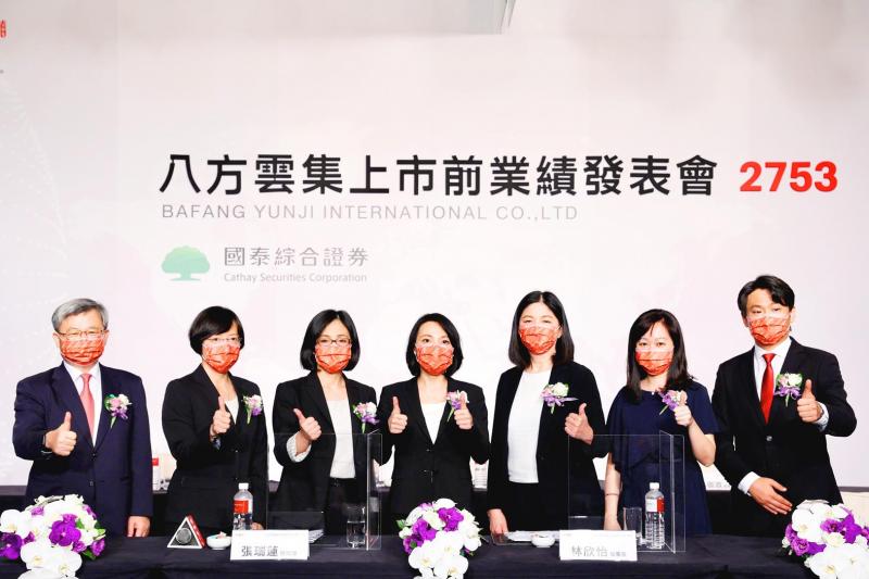 Dumpling chain Bafang Yunji International Co chairwoman Lin Hsin-yi, center, president Grace Chang, third left, and company executives gesture at a pre-initial public offering conference for investors in Taipei yesterday. The company, established in 1998, operates 1,261 outlets in Taiwan and plans to list on the nation’s main bourse next month.