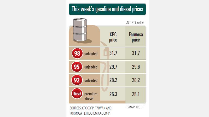 Prices at CPC stations would remain at NT$28.2, NT$29.7 and NT$31.7 per liter for 92, 95 and 98-octane unleaded gasoline respectively, while the price of premium diesel would remain at NT$25.3 per liter, CPC said in a statement.