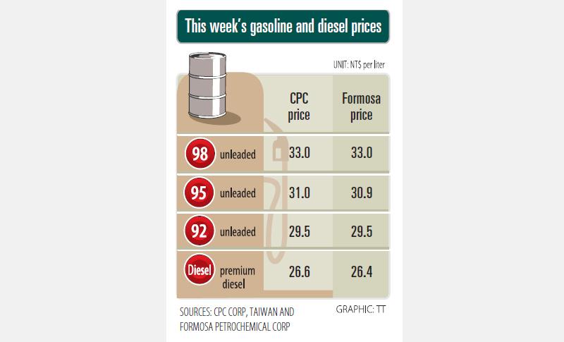 CPC Corp, Taiwan (CPC, 台灣中油) and Formosa Petrochemical Corp (台塑石化) yesterday said that gasoline prices this week would rise by NT$0.8 per liter and diesel prices by NT$0.9, after hikes of NT$0.4 and NT$0.3 respectively last week.