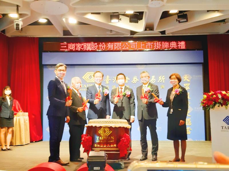 From left, Simple Mart Retail Co general manager Chiu Kuang-lung, Mercuries Group founder George Wong, Simple Mart chairman Chen Hsiang-fen, Taiwan Stock Exchange president Chien Lih-chung and other guests pose for a photograph at the Taiwan Stock Exchange yesterday to celebrate Simple Mart’s listing on the main board. The company, which operates supermarket chain Simple Mart, plans to increase the number of its outlets from 800 to 1,300 by 2023, Chiu said. The company’s stock yesterday closed at NT$84 in Taipei trading, 21.74 percent above the NT$69 per share for its initial public offering.