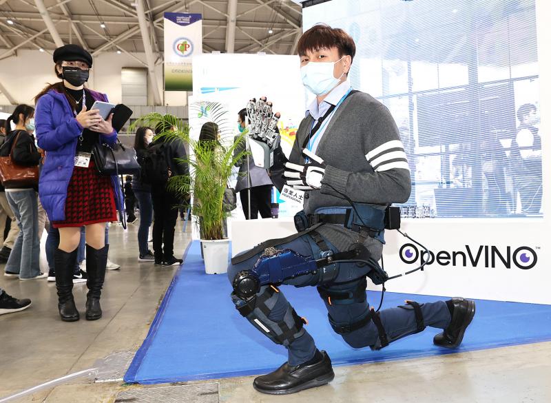 A man demonstrates a wearable hand rehabilitation device and a lower-body exoskeleton on the opening day of the Taiwan HealthCare+ Expo at the Taipei Nangang Exhibition Center’s Hall 1 yesterday. More than 800 exhibitors are showcasing their latest innovations at the event, which features cross-sector cooperation in the medical, electronics, information technology and biopharmaceutical fields. It runs through Sunday.