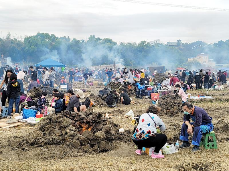 People use traditional earth ovens at a cooking event in Nantou County’s Caotun Township yesterday. Nearly 2,000 people built more than 300 earth ovens at the annual event to experience using a cooking method from early Taiwanese agricultural communities.