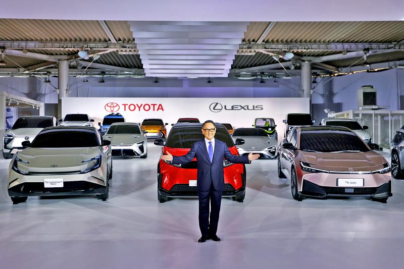 Toyoda delivered a brief sales pitch for each vehicle, then raised his palms to the skies before another curtain revealed 11 more battery-electric models.
