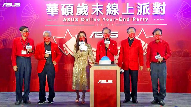 From left, Asustek Computer Inc co-chief executive officer S.Y. Hsu, vice chairman Ted Hsu, entertainer Sandy Wu, Asustek chairman Jonney Shih, Asus Group president Jonathan Tsang and Asustek co-CEO Samsun Hu attend the company’s online year-end party in Taipei yesterday to thank employees. In addition to holding a draw and handing out prizes to boost employee morale, Shih announced employee bonuses totaling NT$1.5 billion, or the equivalent of two to three months’ salary, to encourage them to work harder.