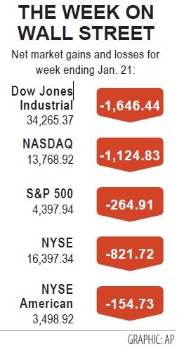 The Dow Jones Industrial Average on Friday fell 450.02 points, or 1.3 percent, to 34,265.37, the S&P 500 lost 84.79 points, or 1.89 percent, to 4,397.94 and the NASDAQ Composite dropped 385.10 points, or 2.72 percent, to 13,768.92.