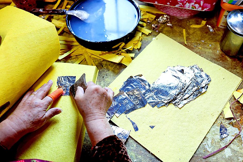 Painstakingly, women of retirement age adorn sheet after sheet of yellow joss paper with gold and silver leaf and red paint to satisfy last orders for sacrificial cash offerings ahead of the Lunar New Year holiday.