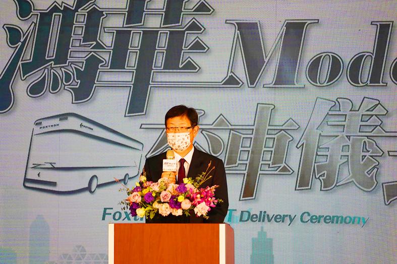 Liu made the remarks at a news conference at which Foxtron Vehicle Technologies Co (鴻華先進) — a Hon Hai-Yulon Motors Co (裕隆) EV design and manufacturing venture — delivered its first electric Model T bus to Kaohsiung Bus Co (高雄客運), which is owned by San-Ti Group (三地集團).