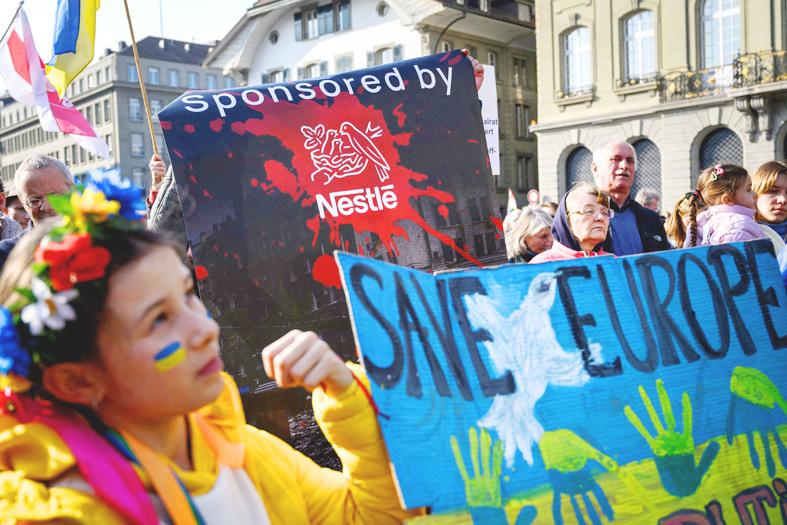 Ukrainian President Volodymyr Zelensky on Saturday called out Nestle for still doing business in Russia in a streamed speech to thousands of protesters in the Swiss capital, Bern.