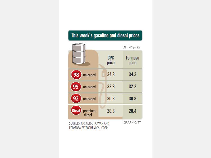 Gasoline prices this week are to fall by NT$0.2 per liter and diesel prices are to fall by NT$0.3 per liter, CPC Corp, Taiwan (CPC, 台灣中油) and Formosa Petrochemical Corp (台塑石化) said separately yesterday.
